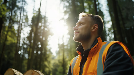 Forestry worker enjoys a moment of serenity in a sunlit forest during a workday