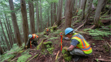 Field researchers navigating dense forests with GPS and soil probes investigating unexplored regions for valuable rare earth elements beneath the surface.