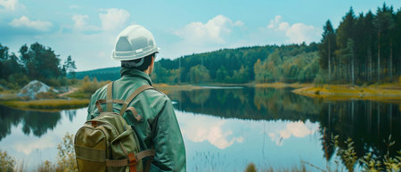 an ecologist in a white helmet and green uniform stands against the backdrop of a lake and forest