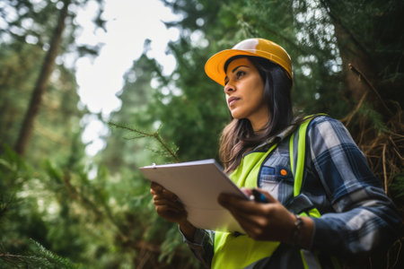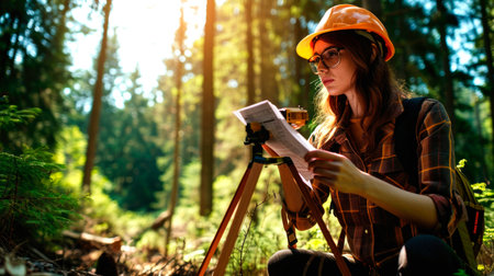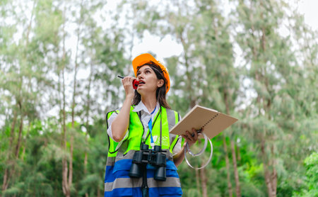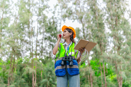 Female environmental surveyor observes forest conditions using binoculars, takes notes, communicates data. Environmental monitoring, biodiversity tracking, role of women in filed forest assessment.