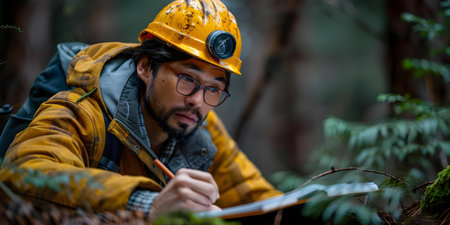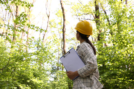 Asian forestry technician takes notes in forest to study renewable energy technology sustainability wearing protective helmet. Concept Forestry Technician, Renewable Energy Technology