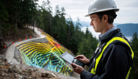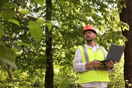 A man in a hard hat and safety vest holds a tablet while surveying a lush, green forest