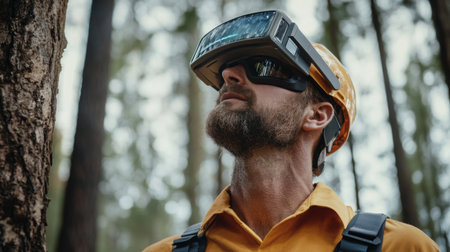 Forest Worker Using Virtual Reality Headset for Training in Pine Forest