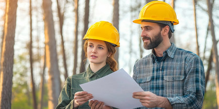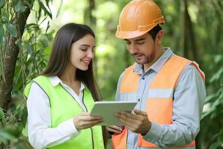 A cheerful architect and construction worker review plans on a digital tablet at a sunny site, surrounded by lush greenery, emphasizing teamwork and innovation.