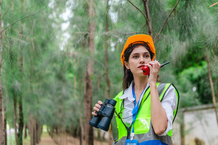 Female environmental surveyor observes forest conditions using binoculars, takes notes, communicates data. Environmental monitoring, biodiversity tracking, role of women in field forest assessment.