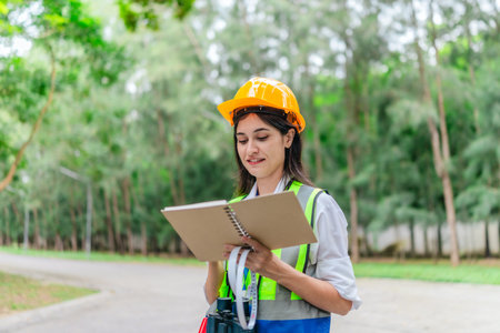 Beautiful and pretty engineer woman show action of confidence and smile with background of nature and forest in day light.