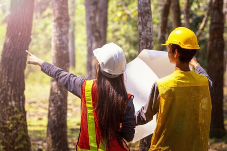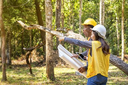 The supervisors are constructing roads in the forest. Young Engineer Male and female holding blueprint and tablet on hand. Engineer team working on project at the forest. Technical operaters.