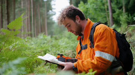 Forest Worker Using Safety Gear During Timber Inspection in Remote Woodland