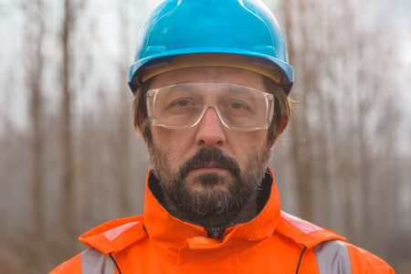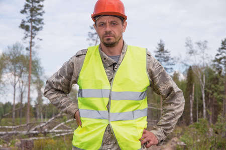 Portrait of a forestry worker. Strict forester looks at the camera. Real working people.