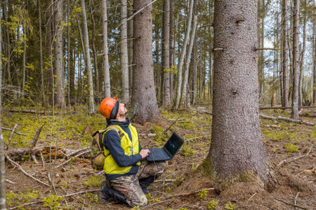 Forest engineer works in the forest with a computer. Digital technologies in the forestry industry.