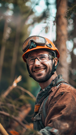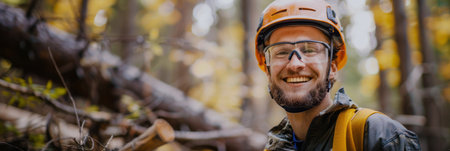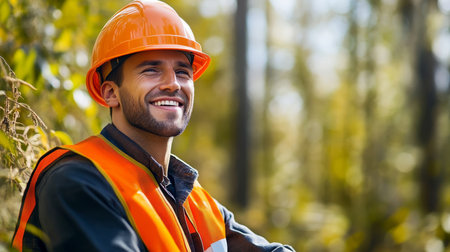 Joyful Construction Professional Outdoors, A Skilled Engineer is Smiling Under Sunlight Amidst Wood