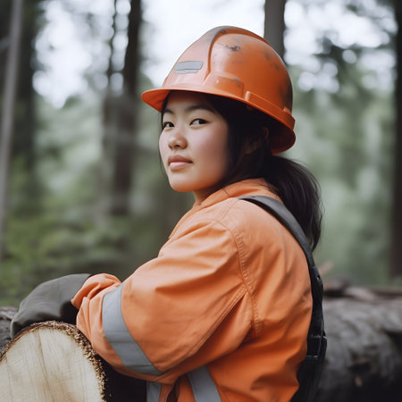 Portrait of Asian woman lumberjack in orange uniform with hard hat.