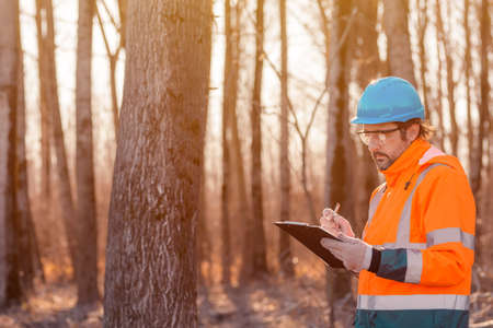 Forestry technician writing notes on clipboard notepad paper in forest during logging deforestation process