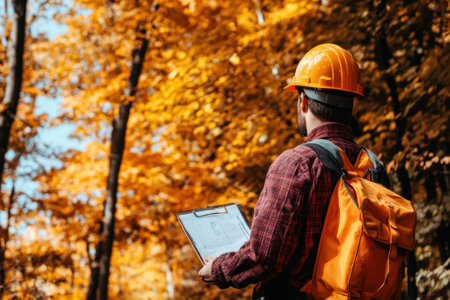 A forest worker wearing a hard hat carries a clipboard while surveying the colorful autumn trees around him.