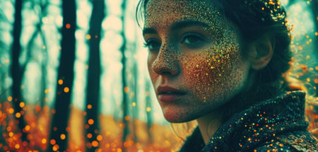 woman's face with gentle sunlight filtering through forest leaves, woodland background generative ai