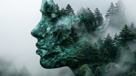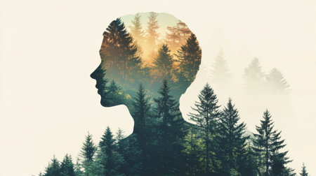 A conceptual image featuring a calm silhouette of a human face filled with a lush green forest landscape. High quality photo