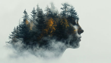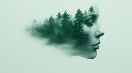 A creative visualization showcasing a womans silhouette filled with dense trees and mist.
