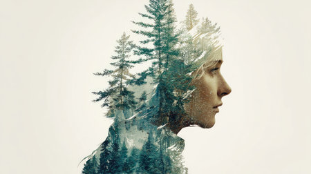 This composite image features a woman's profile overlapping a forest scene. The artwork blends the woman and trees through a double exposure technique creating a surreal composition with a focus on natural elements. The image exhibits a high-key lighting, ideal for conceptual visuals and stock photography.