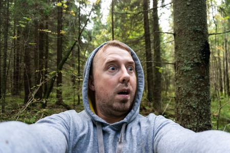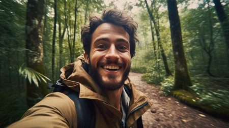 Picture image of wanderer person in touristic gear enjoying breathtaking forest hiking making shooting selfies