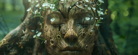 Carved Wooden Face with Blooming Flowers Emerging from the Enchanting Forest Canopy