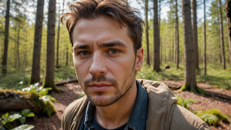 Explorer of the Wild Closeup Portrait of Man with Brown Hair in Forest Adventure