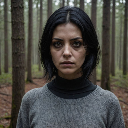 Mysterious Woman At Forest Edge Spooky Headshot In Gray Sweater