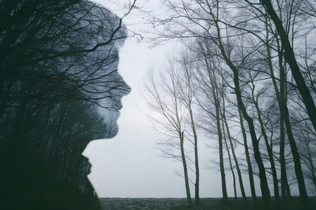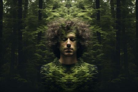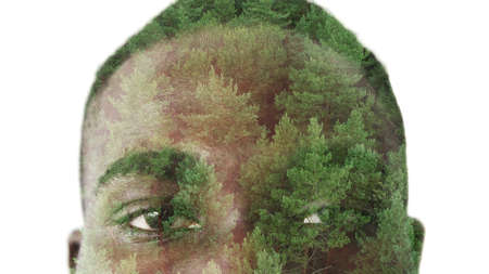 A unique blend of art and nature is captured in a double exposure image showing a mans face merging with trees, branches, and twigs