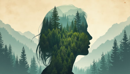 Artistic double exposure image blending a woman's profile with the lush greenery of a forest, symbolizing unity with nature.