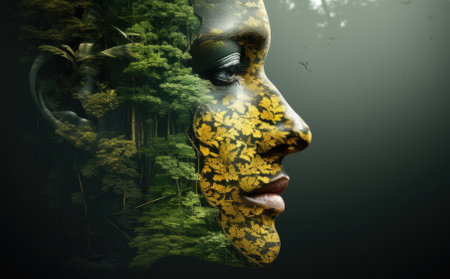 A captivating artwork blending nature and humanity, showcasing a face formed by lush greenery and the sky.