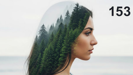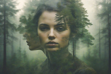 Nature merges with a womans portrait in a double exposure, where forest trees transform into her face