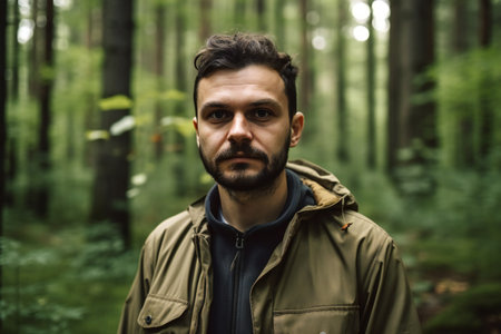 An AI generated illustration of a Caucasian male wearing a dark jacket in a jungle
