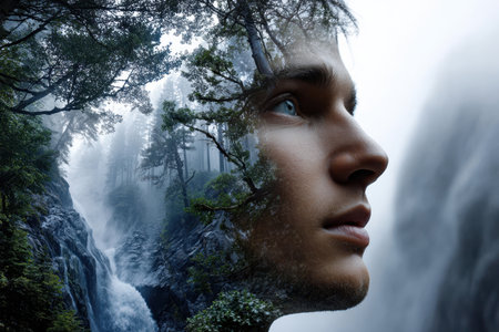An artistic representation blending a person's profile with a cascading waterfall and lush trees, creating harmony.