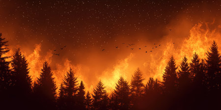 High-Resolution Photo Capture: A forest fire under the starry night sky, with silhouettes of trees and smoke in the background. The colors should be warm, reflecting orange flames against the cool black tones of the sky and the dark silhouettes of pine trees. There is an area for text in the top-right corner, a large space on the left side for a logo or brand name, and smaller elements like birds flying above the tree line. This scene captures nature's raw power amidst the darkness. --ar 2:1 --v 6.1 Job ID: e69d2830-40d9-405a-9bf0-50f8b66a97b6
