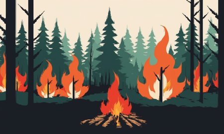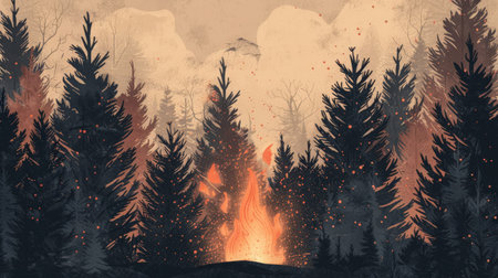 Vivid forest scene illustrating a raging wildfire with intense flames consuming the undergrowth. Tall, silhouetted trees loom over the burning landscape, with smoke filling the atmosphere above the fire.