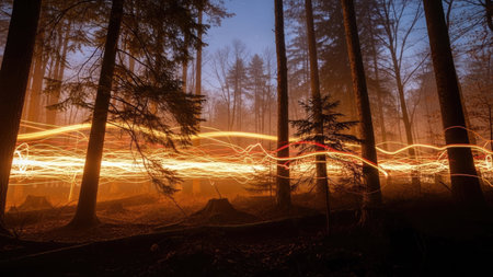 Fiery light trails in the forest at night. Long exposure.