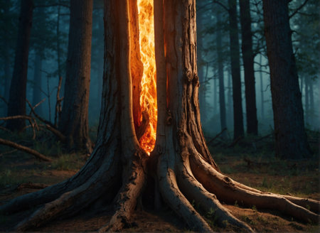 Tree burning inside in the forest at night. 3d rendering