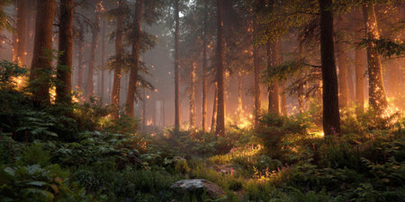 Foggy forest at sunrise. 3d rendering toned image