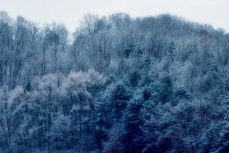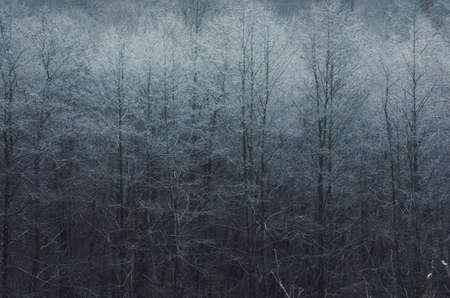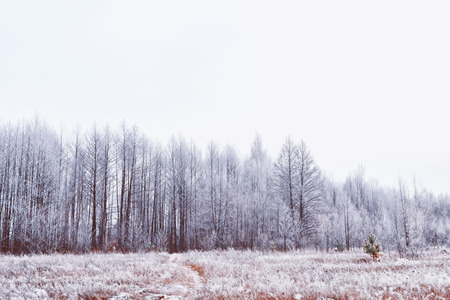 Forest meadow and trees covered with crystal clear hoarfrost. Idyllic landscape. Mysterious blue light. Winter wonderland. Nature, climate change, ecology, environmental conservation