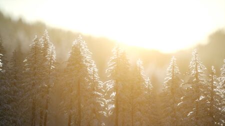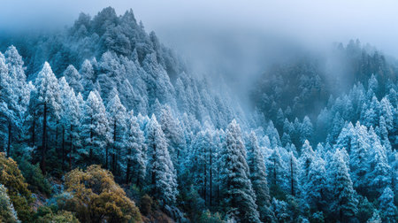 Misty Winter Wonderland: A Serene Landscape of Snow-Covered Trees in the Mountains