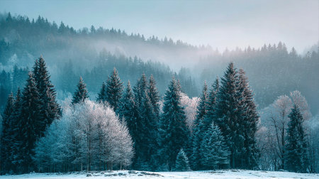 Experience the beauty of a serene winter landscape, showcasing frosted trees and misty mountains. This tranquil scene evokes a peaceful connection with nature, ideal for winter-themed projects.