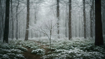 A single, snow-covered tree stands in a serene winter forest. The scene is peaceful and magical.