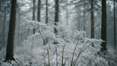 A frosty winter scene in a forest at sunrise. Snow covers the branches and ground, creating a beautiful and peaceful atmosphere.