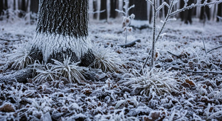 Frozen grass in a winter forest, with delicate ice crystals covering the blades. The serene scene captures the beauty of the frozen landscape, creating a peaceful, frosty atmosphere amidst the trees.