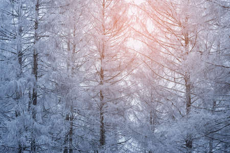 Winter landscape with trees covered with snow and hoarfrost in mountains