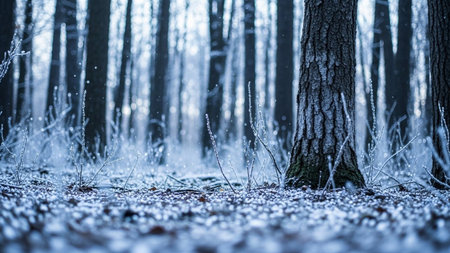 A close-up, low-angle view of a forest floor in winter. Tall, dark tree trunks dominate the background, out of focus. The foreground is covered in a dusting of snow and scattered leaves. Delicate branches and twigs are coated in sparkling ice crystals, catching the light. The color palette is dominated by cool blues and whites, with hints of dark brown from the tree bark and fallen leaves. The evokes a sense of quiet stillness and the crisp beauty of a frozen natural environment.