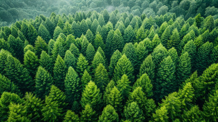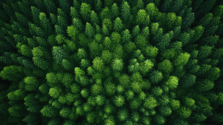 An overhead view reveals a dense forest canopy composed of numerous tall evergreen trees. The scene showcases a variety of green hues, with textures of needles and branches. The composition is framed by subdued lighting. The image suits commercial and editorial applications to depict nature or environment.