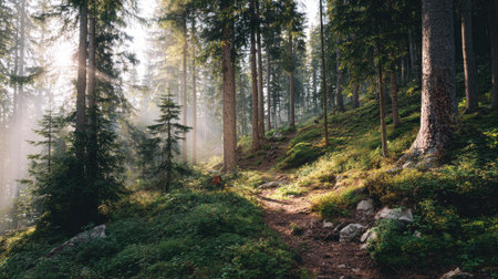 A captivating forest scene featuring tall evergreen trees that allow dappled sunlight to filter through, creating a tranquil atmosphere perfect for nature lovers.