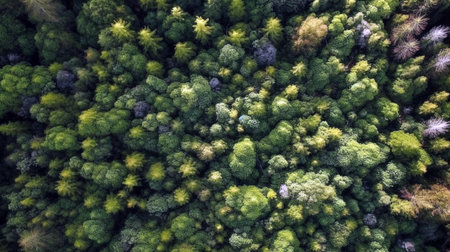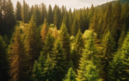 An overhead view reveals a dense forest canopy composed of numerous tall evergreen trees. The scene showcases a variety of green hues, with textures of needles and branches. The composition is framed by subdued lighting. The image suits commercial and editorial applications to depict nature or environment.