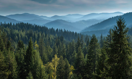 Layers of dense evergreen forests stretch across misty mountain ranges, fading into a hazy sky, creating a serene and atmospheric landscape.