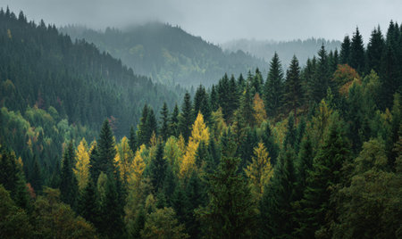 the mountain slopes, cloaked in a misty veil, showcase a striking contrast of deciduous trees, their autumnal hues muted by the rain, alongside towering firs, their evergreen canopies a vibrant splash against the grey sky, as the tops of the trees peek out from the foggy veil. ai generated